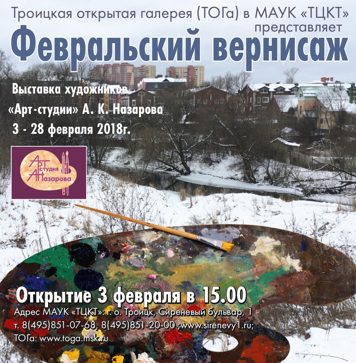 Дорогие друзья! С 3 по 28 февраля 2018 г. приглашаем Вас посетить Троицкую открытую галерею (ТОГа) в МАУК «ТЦКТ», расположенную по адресу г. Москва, г.о. Троицк, Сиреневый бульвар, д. 1. Там состоится художественная выставка, в которой будут представлены работы живописцев из Арт-студии А.К. Назарова. Открытие выставки состоится 3 февраля в 15 часов.