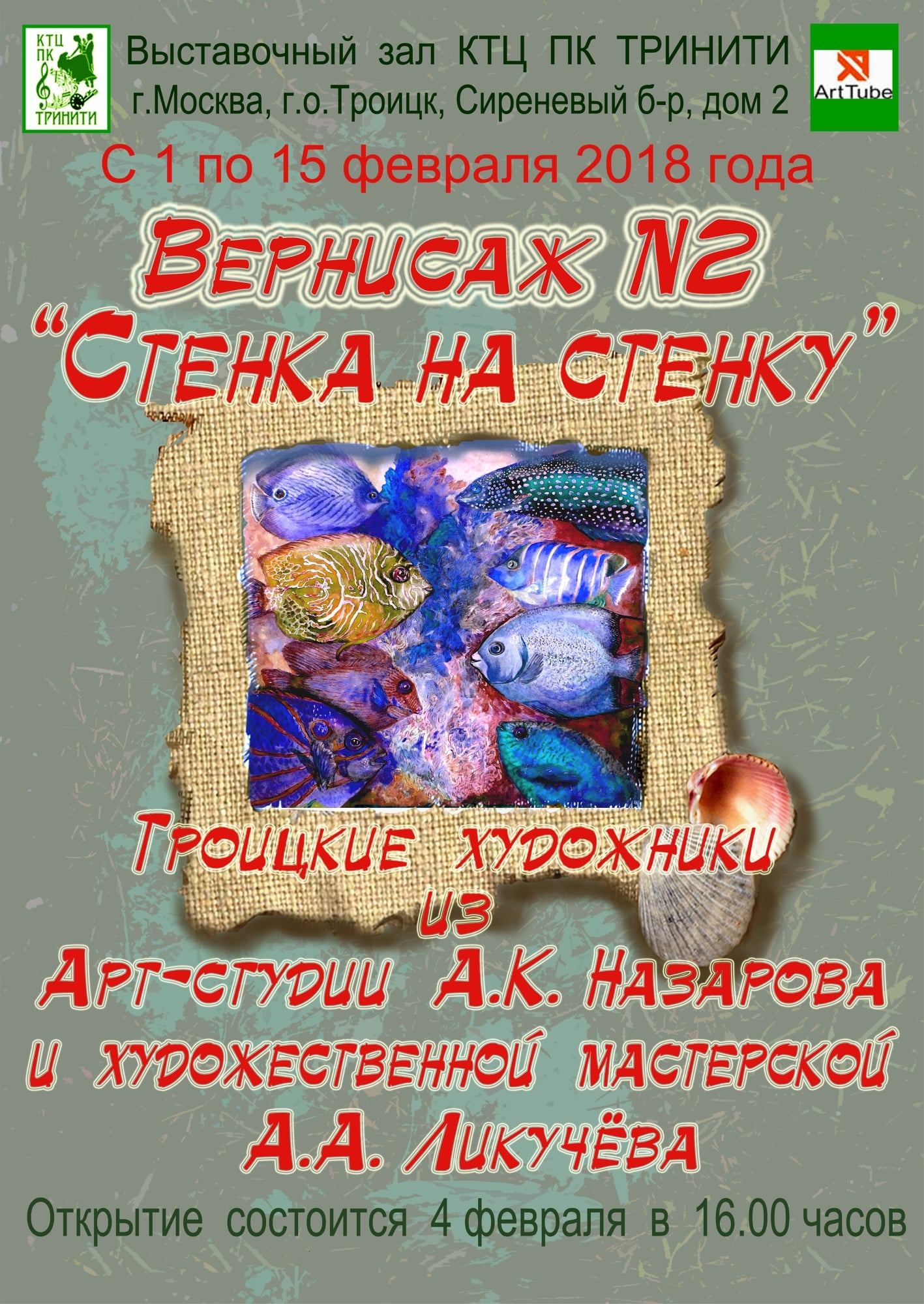 Дорогие Друзья! 4 февраля 2018 г. в 16 часов состоится открытие экспозиции «Стенка на стенку», в которой примут участие художники из Арт-студии А.К. Назарова и художественной мастерской А.А. Ликучёва. Выставка будет проходить в Выставочном зале Культурно-творческого центра ТРИНИТИ по адресу г. Москва, г.о. Троицк, Сиреневый бульвар, д. 2 и продлится до 15 февраля 2018 г.