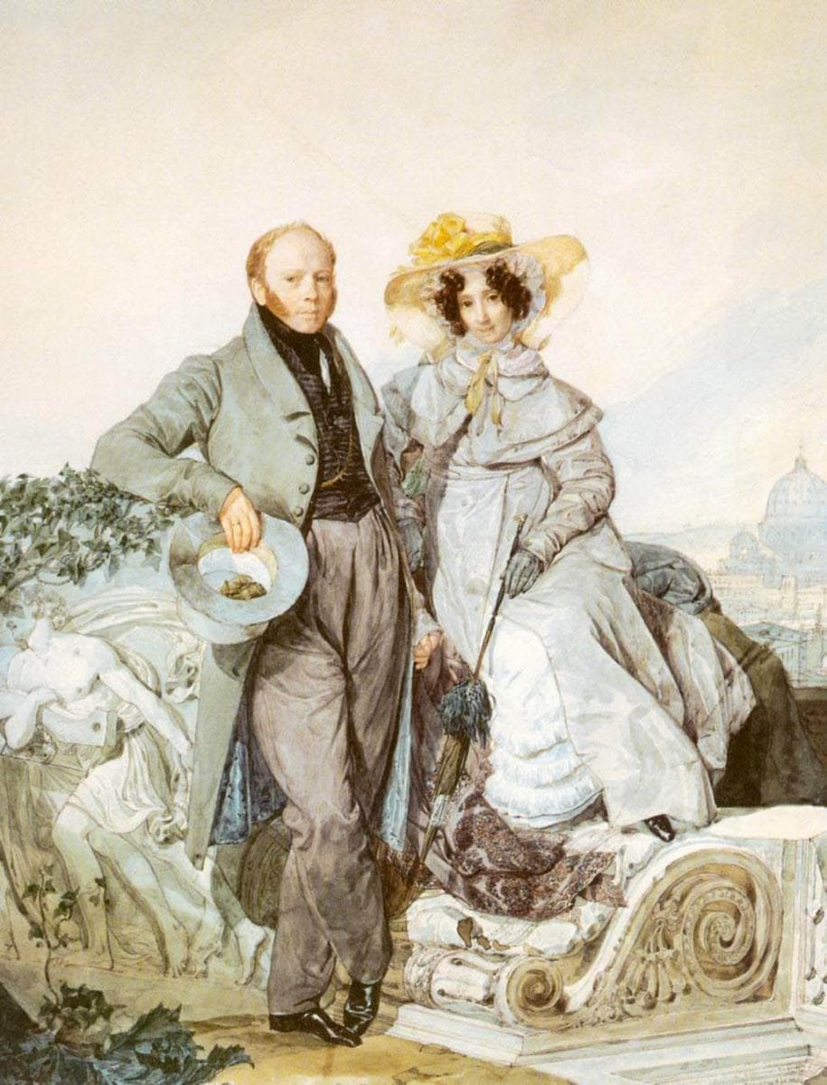 По-видимому, те же задачи ставил перед собой К. П. Брюллов еще в начале XIX века, добиваясь передачи воздушной среды и пространства в сюжетной и портретной акварельной живописи и приходя к еще более цельному цветовому решению. Мы имеем удивительную, редкую возможность увидеть в начале XXI века замечательный портрет Г. Н. и В. А. Олениных среди атрибутов архитектуры на фоне римского пейзажа, а также серию женских портретов, выполненных мастером способом, о котором идет речь.