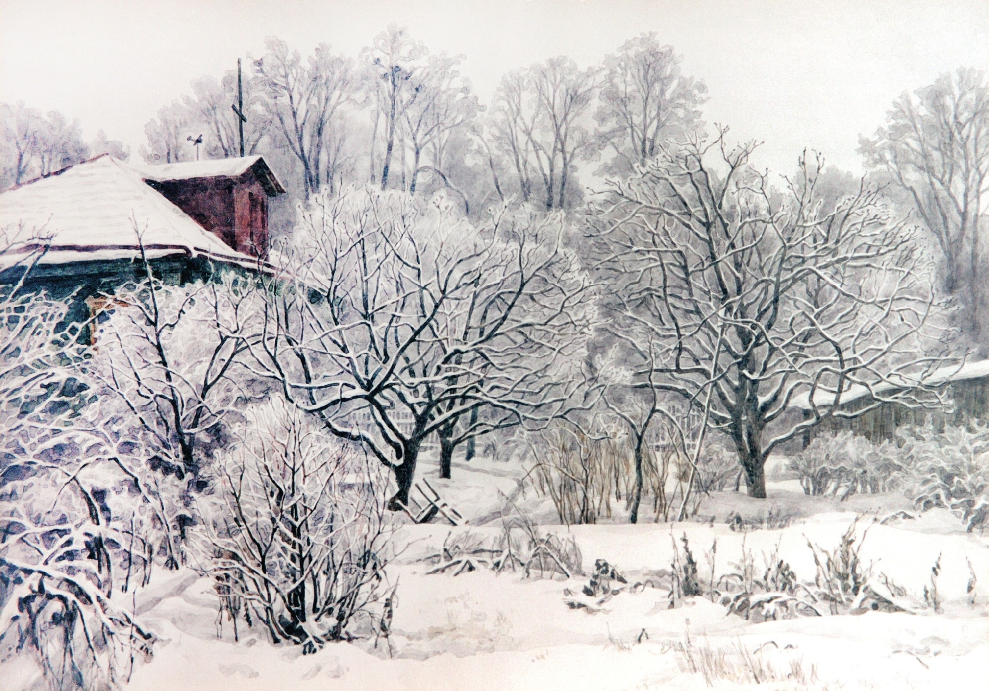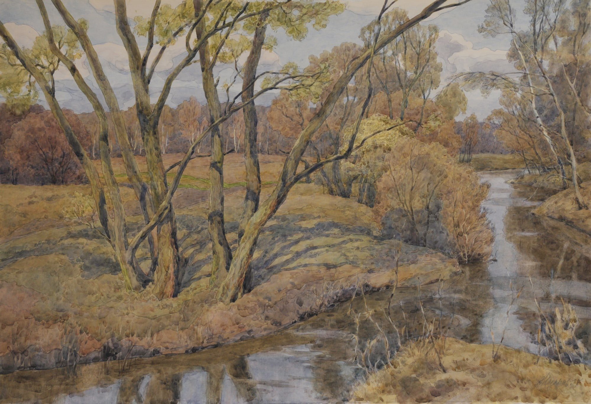 В современной акварельной живописи этот способ практически не встречается. Во всяком случае мне не приходилось видеть работы, выполненные таким способом, на выставках. В некоторых случаях я использовал этот способ, особенно в зимних пейзажах, расцвечивая их затем охрой светлой, английской красной и неяркой зеленью. Мне пришлось, идти от обратного в работе над теплым майским пейзажем с цветущей ивой и распускающейся зеленью над рекой. Чтобы передать теплоту воздуха, я выполнил сначала подмалевок, используя золотисто-желтую ЖХ и охру красную, а затем довел работу до закопченного состояния с помощью алой красной, зеленой и синей красок.
