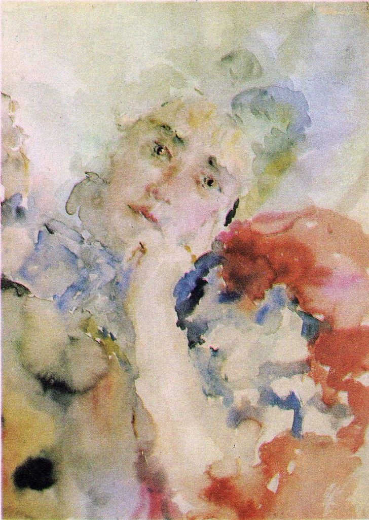 Затем, набрав крупной кистью большое количество воды с краской, он мягко втирал ее в поверхность бумаги, добавляя другие цвета для получения необходимого сложного тона, т. е. получалась своеобразная палитра на самой работе. С большим мастерством художник управлял широкими цветовыми потёками с помощью кисти, чередуя темные и светлые участки, оставляя порой почти нетронутой бумагу.