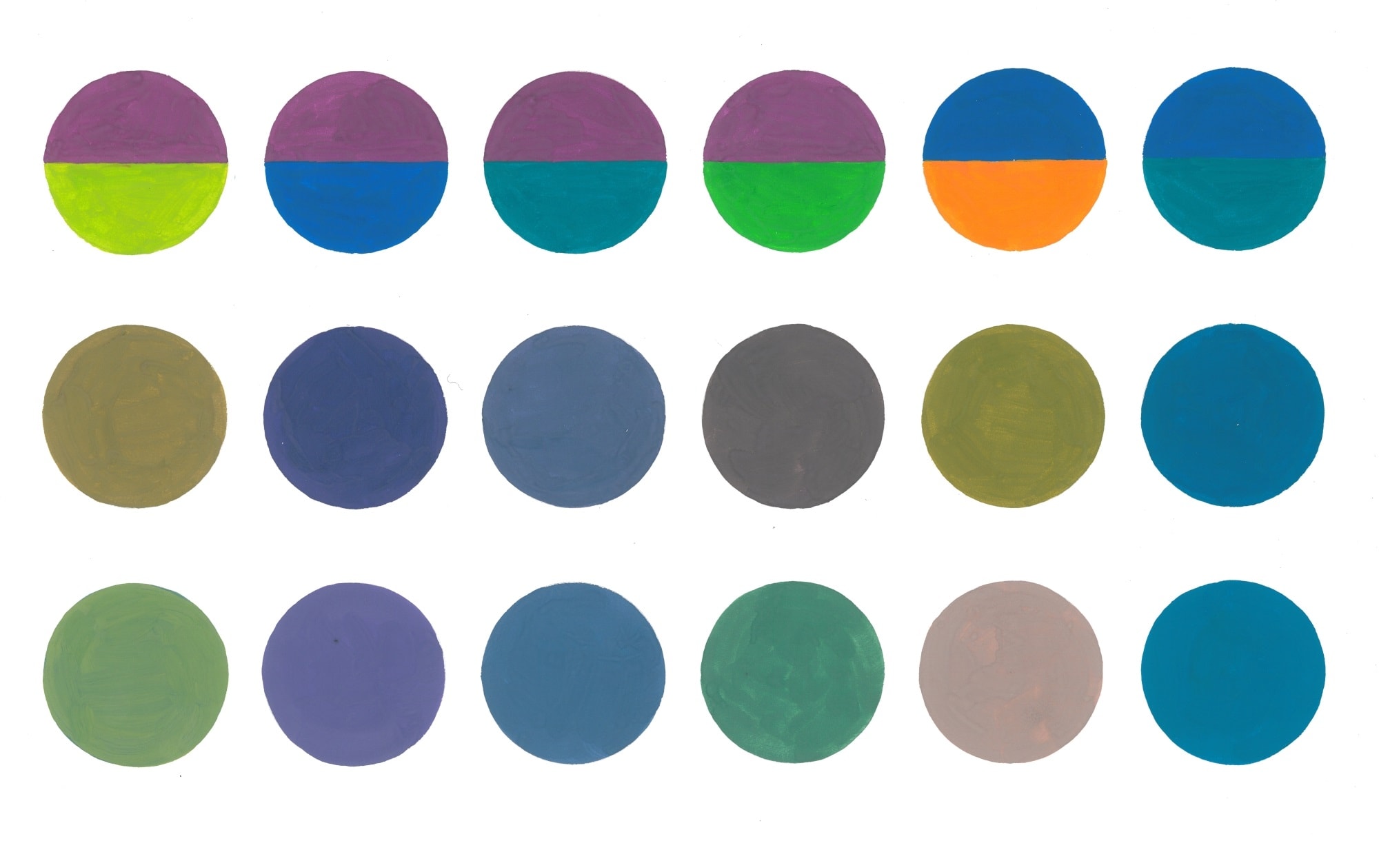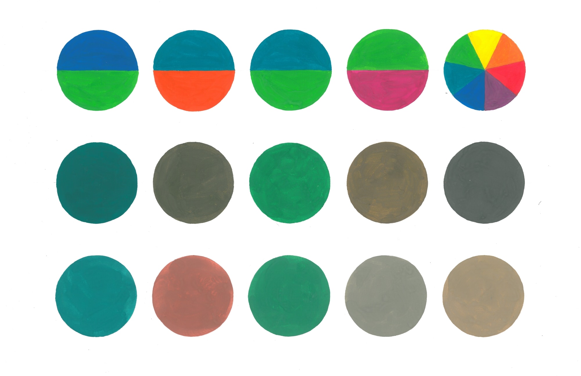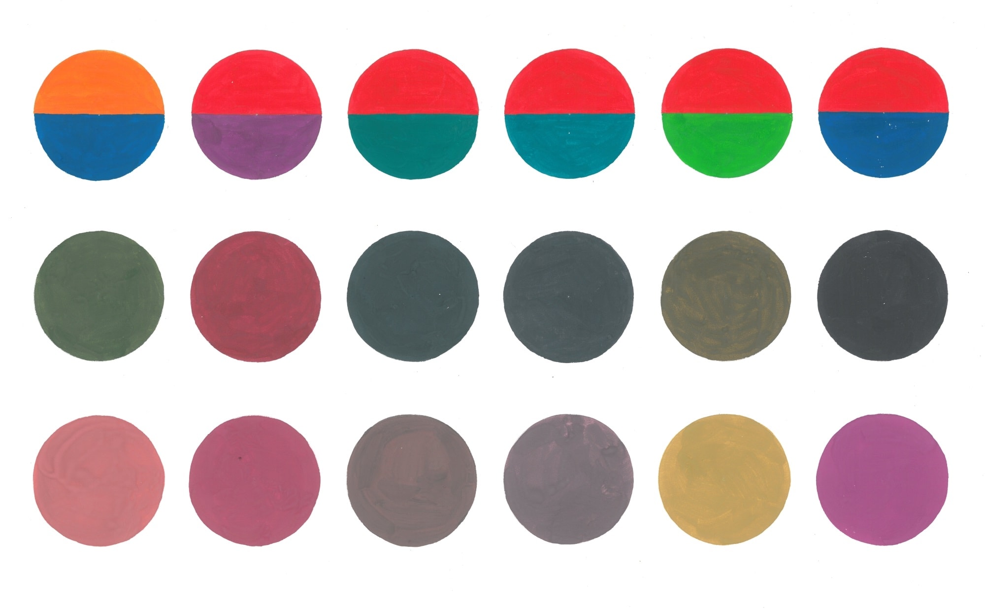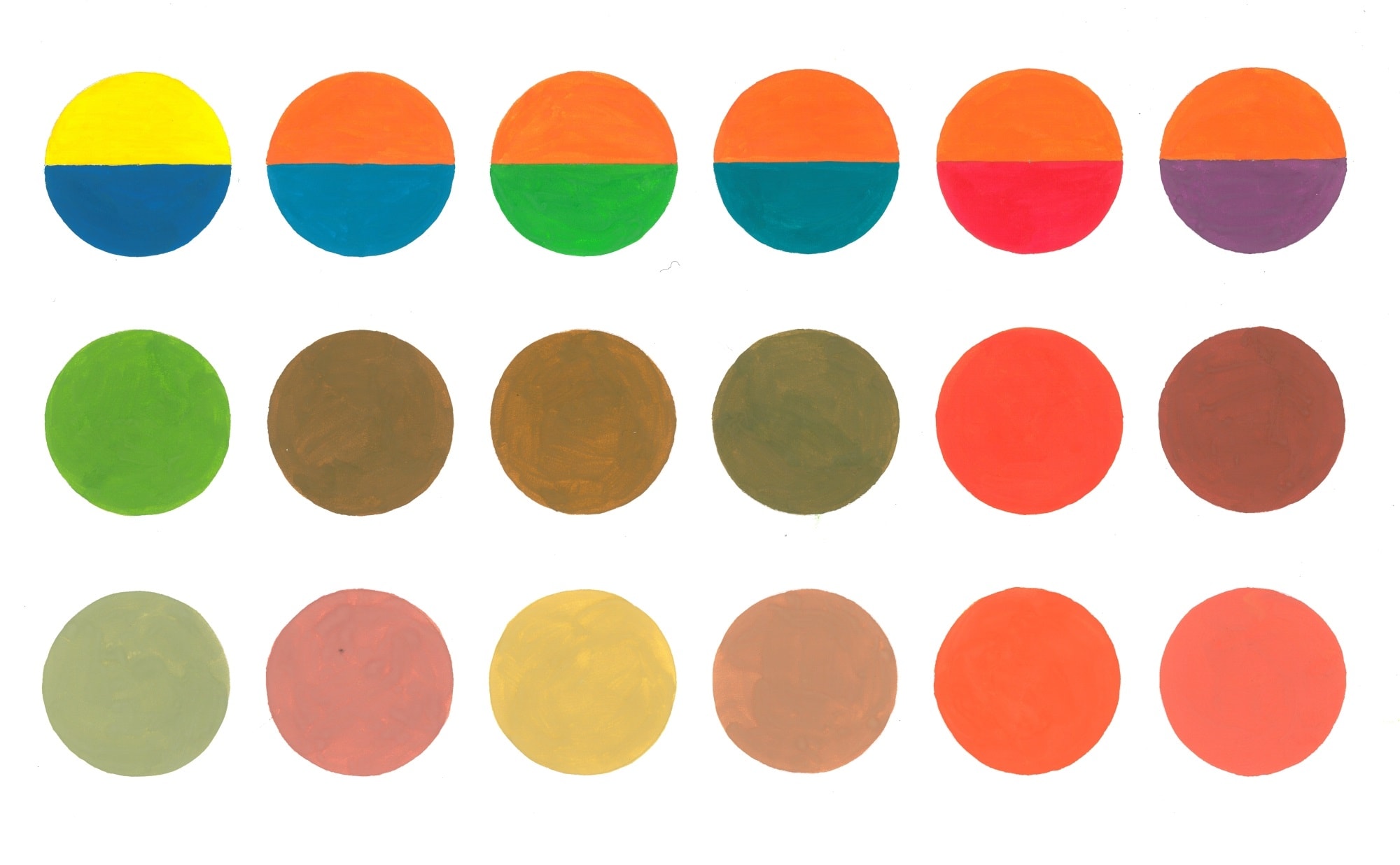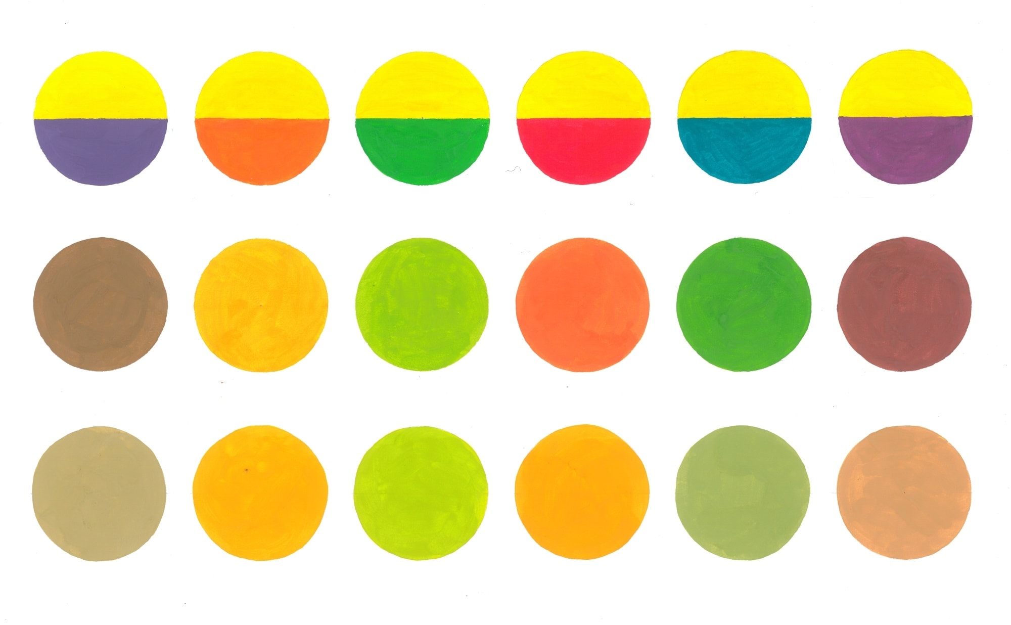 Ниже приведены работы учеников арт-студии, иллюстрирующие различия двух видов смешения. В верхнем ряду расположены смешиваемые цвета, во втором ряду показан результат механического смешения цветов на палитре, а в третьем — результат оптического смешения, полученный с помощью быстрого вращения исходного круга с двумя цветами с помощью электромоторчика.
