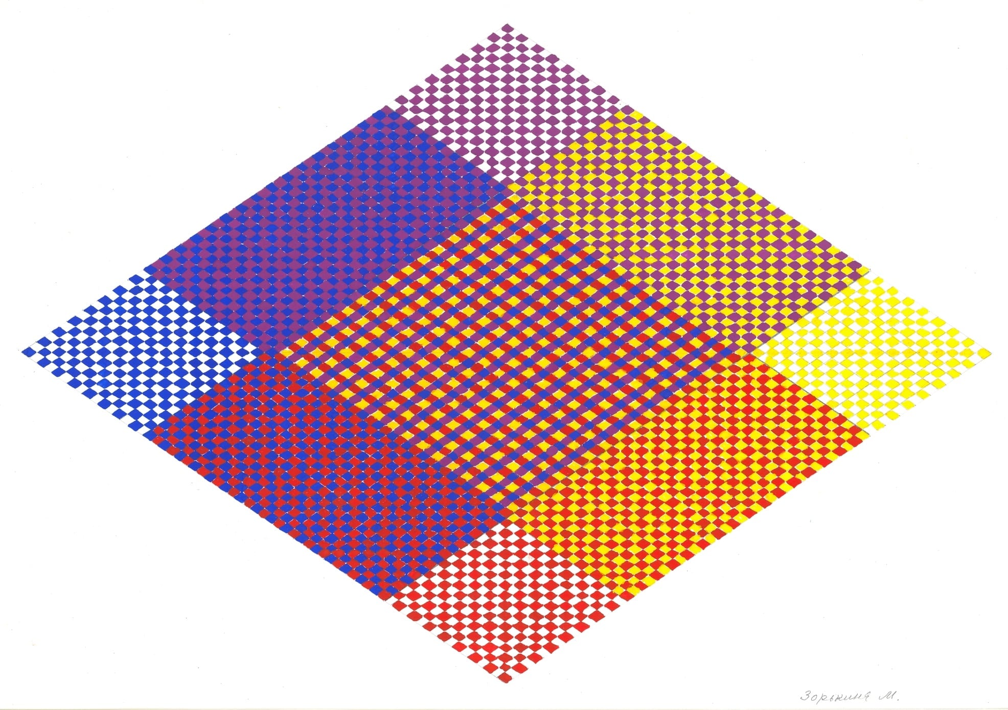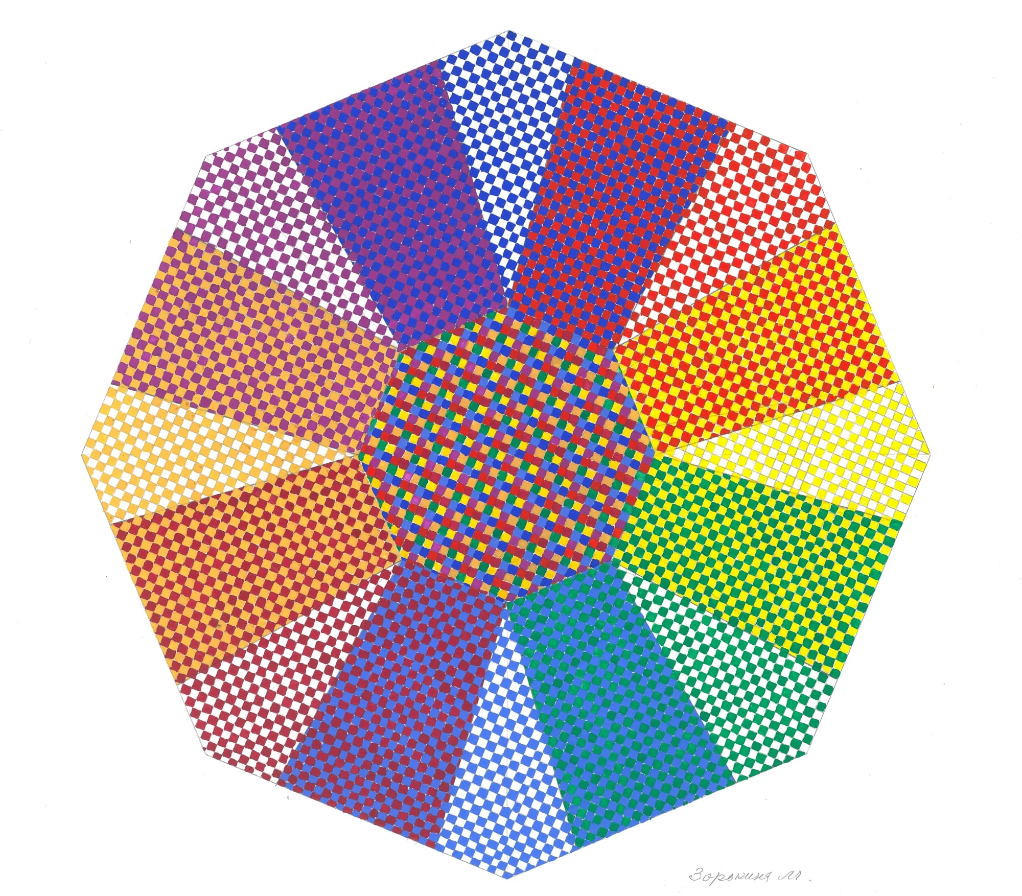 Интересный результат оптического смешения получается, если изобразить геометрическую композицию пуантилистическим способом акварелью или гуашью.