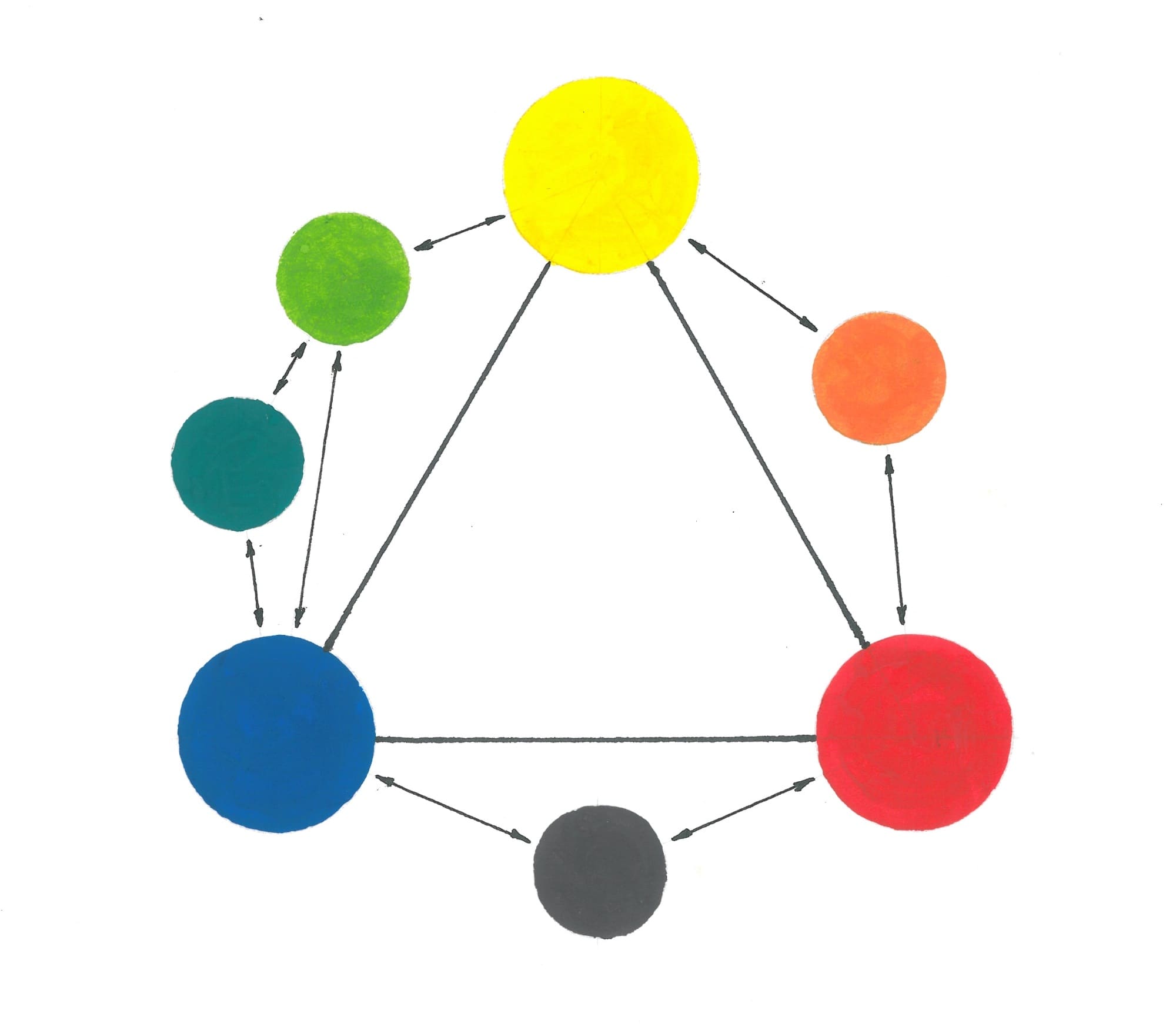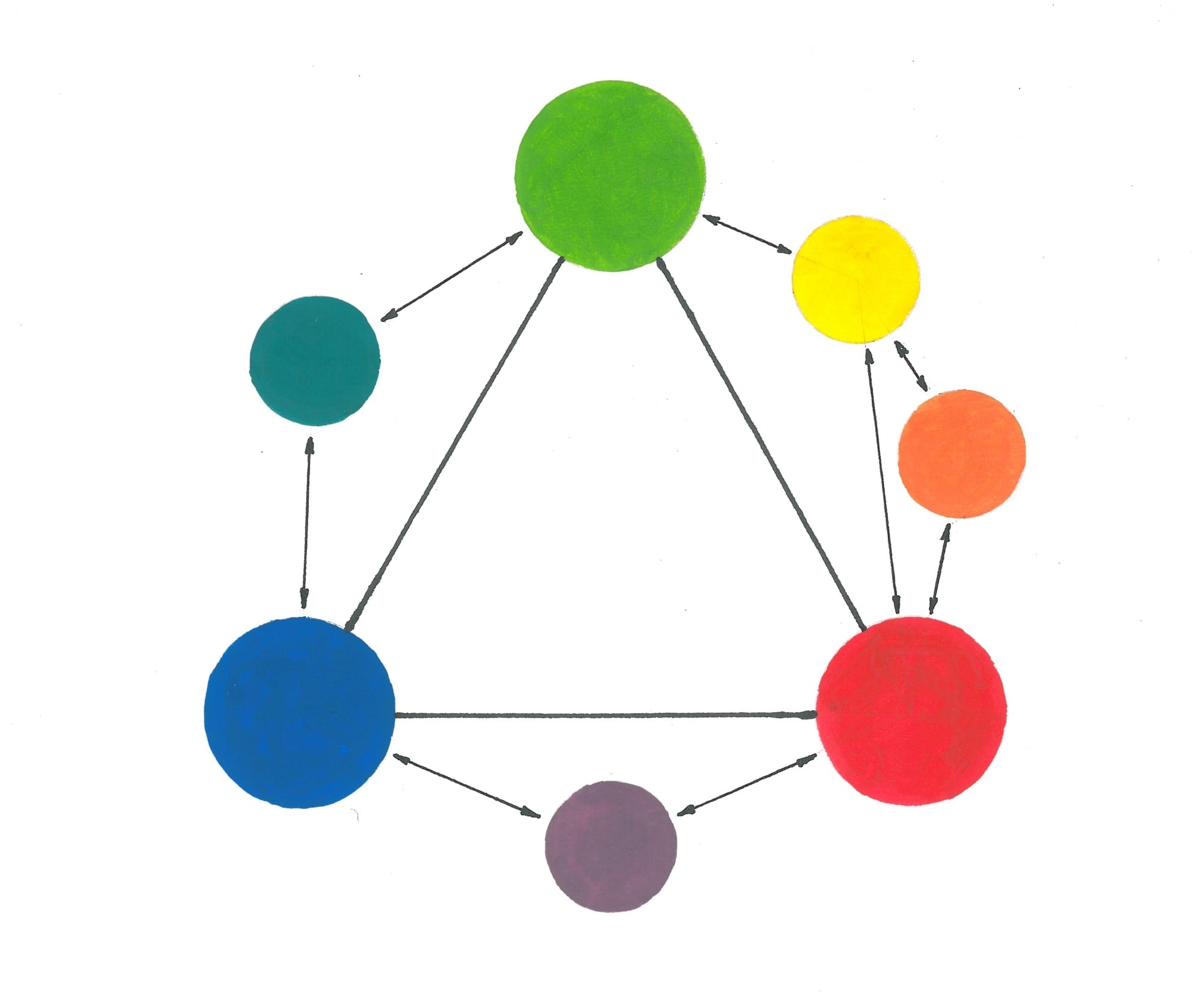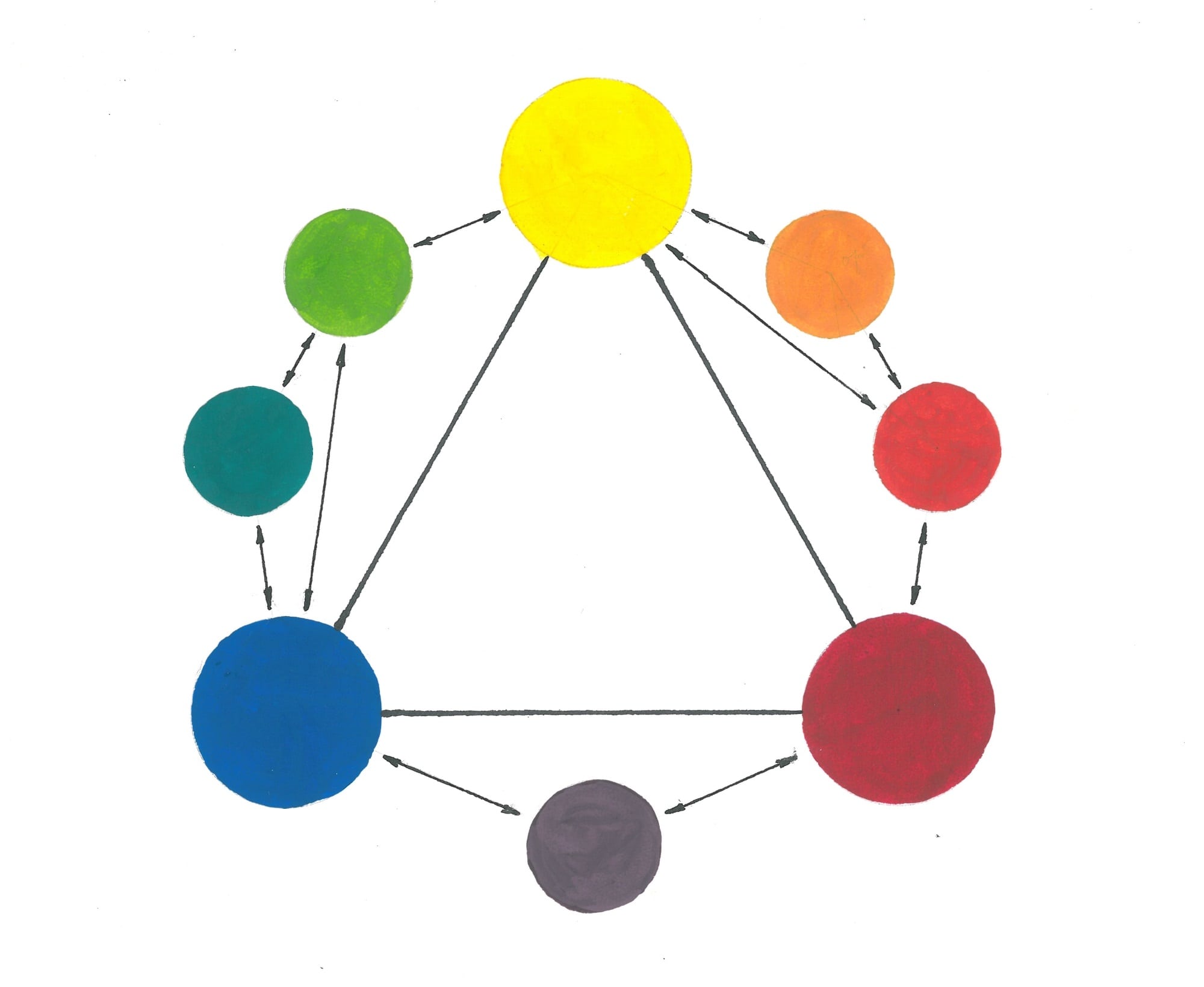 В практике обучения художников сложилась схема основных цветов, состоящая из желтого, красного и синего. Смешивая их между собой на палитре, мы должны получить полный цветовой спектр. На представленной схеме постараемся это воспроизвести.