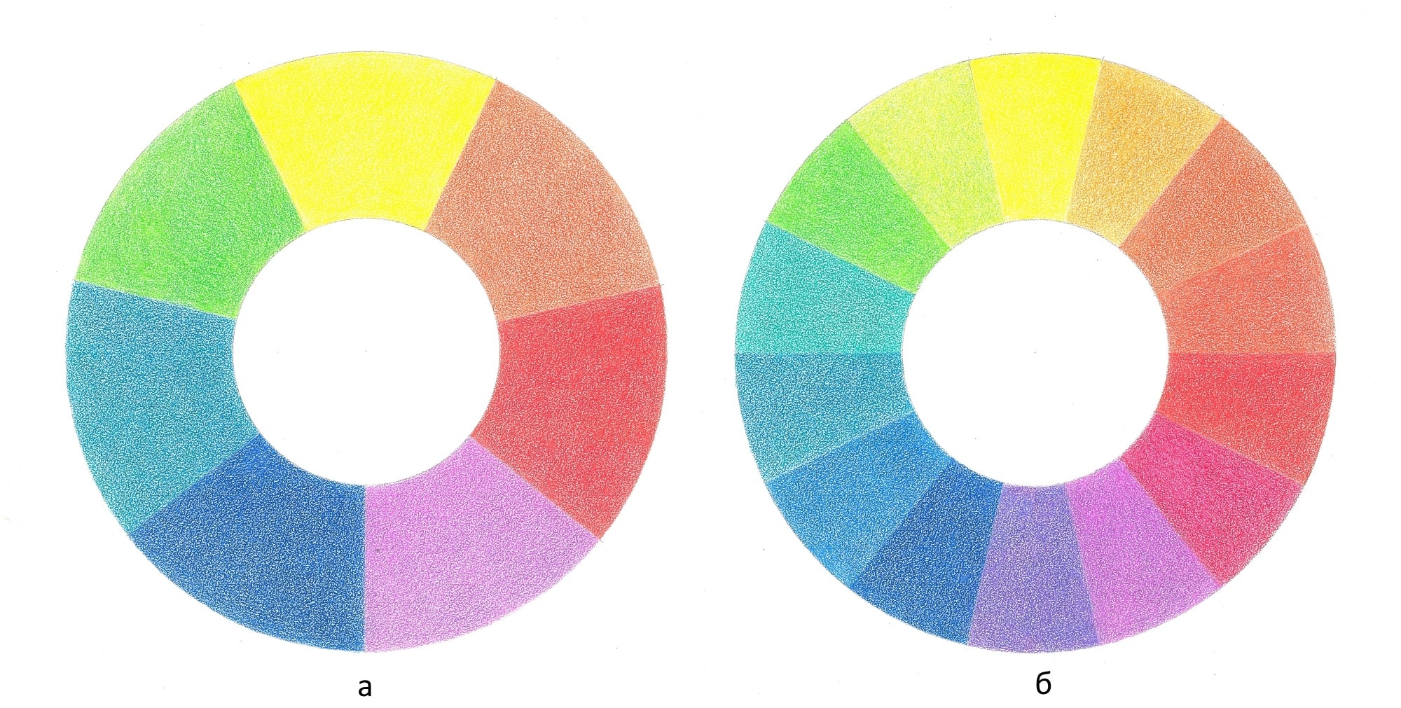Для еще большей наглядности, между основными цветами расположим промежуточные, и тогда очень хорошо будут видны все противоположные цвета, которые часто называют дополнительными (2б).
