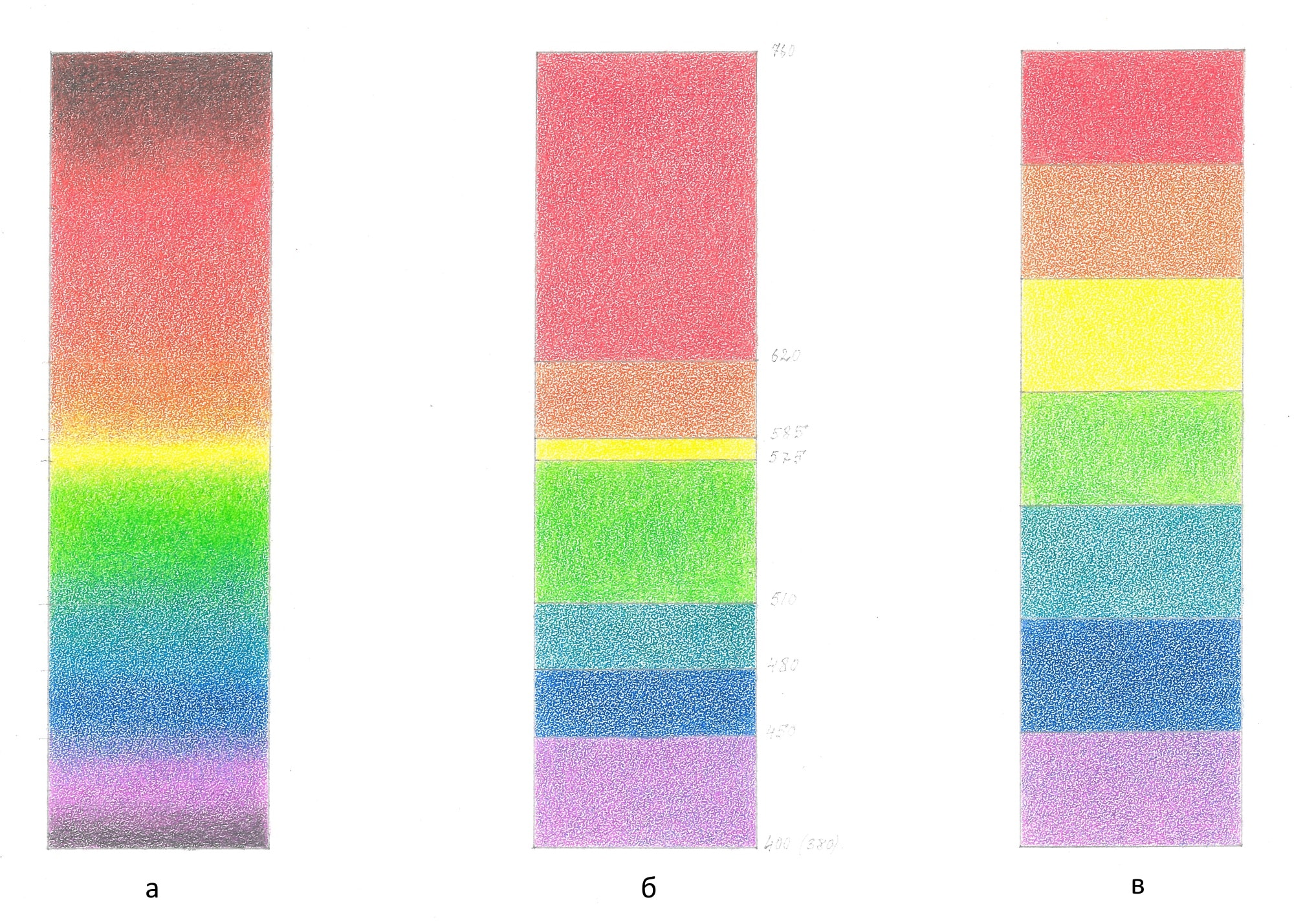 Глядя на неё, можно заметить, что красные и оранжевые цвета занимают большие участки спектра по отношению к другим цветам. Для наглядности разграничим цвета между собой (1б). Надо отметить, что любой источник света, включая огонь и раскаленные вещества, имеет свой характерный спектр, но состоящий из тех же семи цветов. В нашей работе мы будем использовать спектр с равномерно расположенными цветами (1в), поскольку это будет удобно при построении схем и цветового круга, о чем речь пойдет далее.